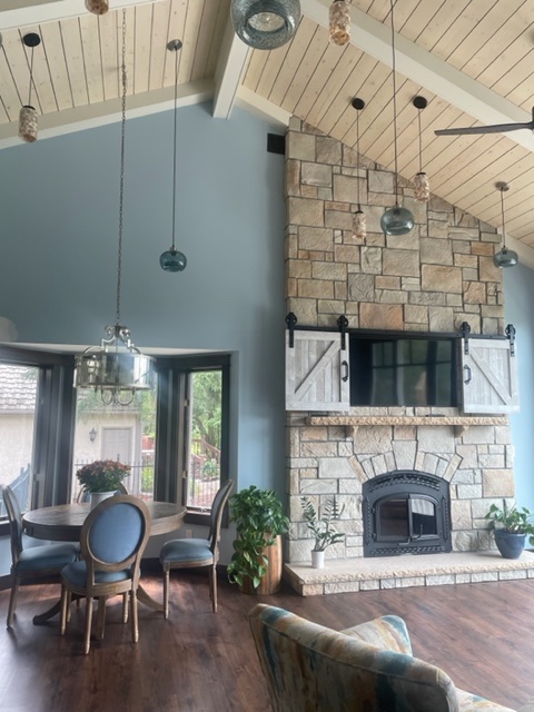 Love of travel inspired them to create a Mediterranean/Coastal design with that beach home feel. They define this newly renovated design/build as much more than seashells and nautical décor. It is about structural design—architecture with wide arched openings. A design that is enhanced with rich wood and a light and airy cream finish, whitewash ceilings with large cream beams. They enhanced the open floor plan with nineteen raining pendant lights, a stately stone hearth, and natural colors. The center of the great room features and a flat natural stone floor to ceiling fireplace. The style they were looking to achieve has some traditional characteristics but with a coastal, modern/contemporary Mediterranean twist.